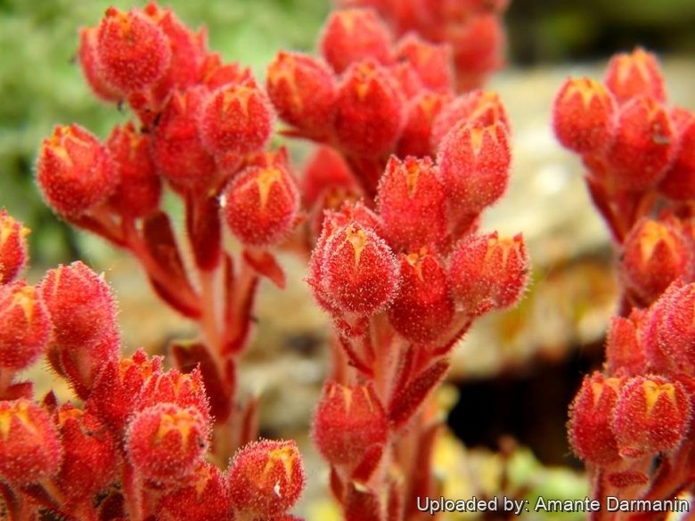 Inflorescence: Flowering stems 5-10 cm tall bearing branched cymes of six to twelve green and yellow flowers. Peduncles and calyx green, densely glandular; petals short erect, 3-4 mm long and yellow. The whole inflorescence is glandular-hairy with white hairs.