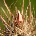 Description: The Grama Grass Cactus Sclerocactus papyracanthusSN|13716]]SN|13716]], best known as Toumeya papyracanthaSN|13720]]SN|13720]] is a tiny solitary cactus, rarely branched from the base in old age, with very characteristic flattened centrals spines resembling dried grass leaves or wood shavings. The main central spine, the longest and widest, is the lower central. The main central is flat, thin, flexible, curved, and often twisted.