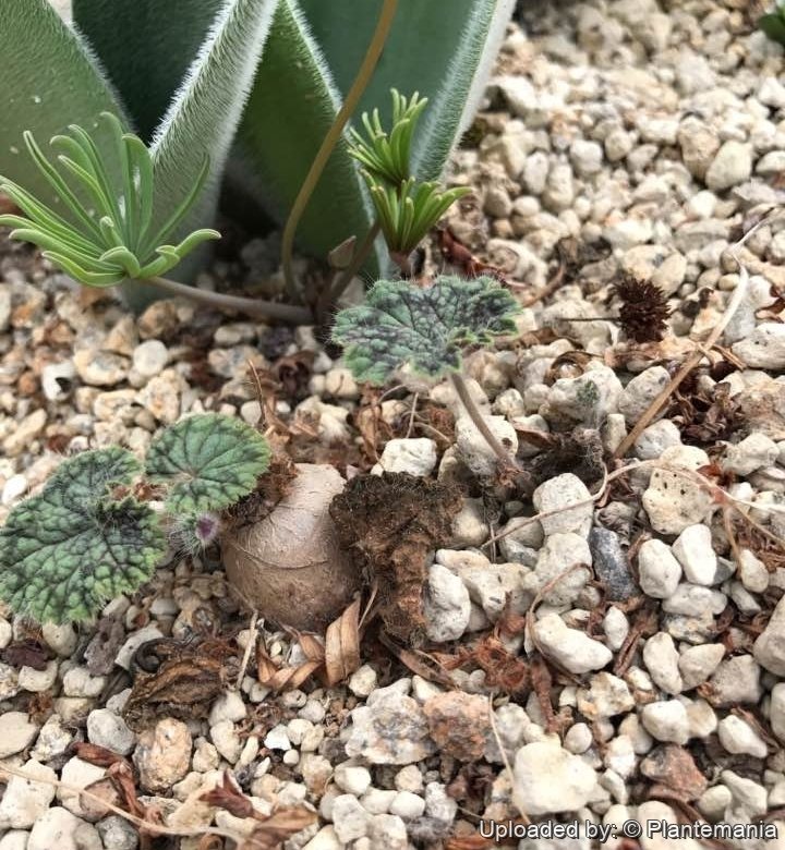 Description: Pelargonium barklyi is a nice geophytic plant that grows from a large tuber and attains heights of up to 30-50 centimetres. During the winter months it produces large heart shaped leaves which varies in shape and size from plant to plant. It is grown primarily for the leaf, which are very decorative. The top of the leaf is light green distinctly hairy and covered with deep-veined veins with often a dark purple zones around the edge. The underside of the leaves is deep purple. These are followed by creamy white flowers, with just a hint of a nectar guide held on long petioles. The flowers appear at the end of the winter and in early spring. The plant is dormant and leaf-less in summer. P. barklyi is unlikely to be confused with any other species having tuberous underground parts, as its leaves are so characteristic.